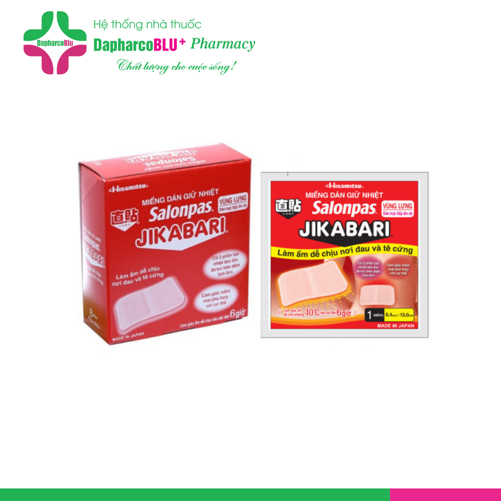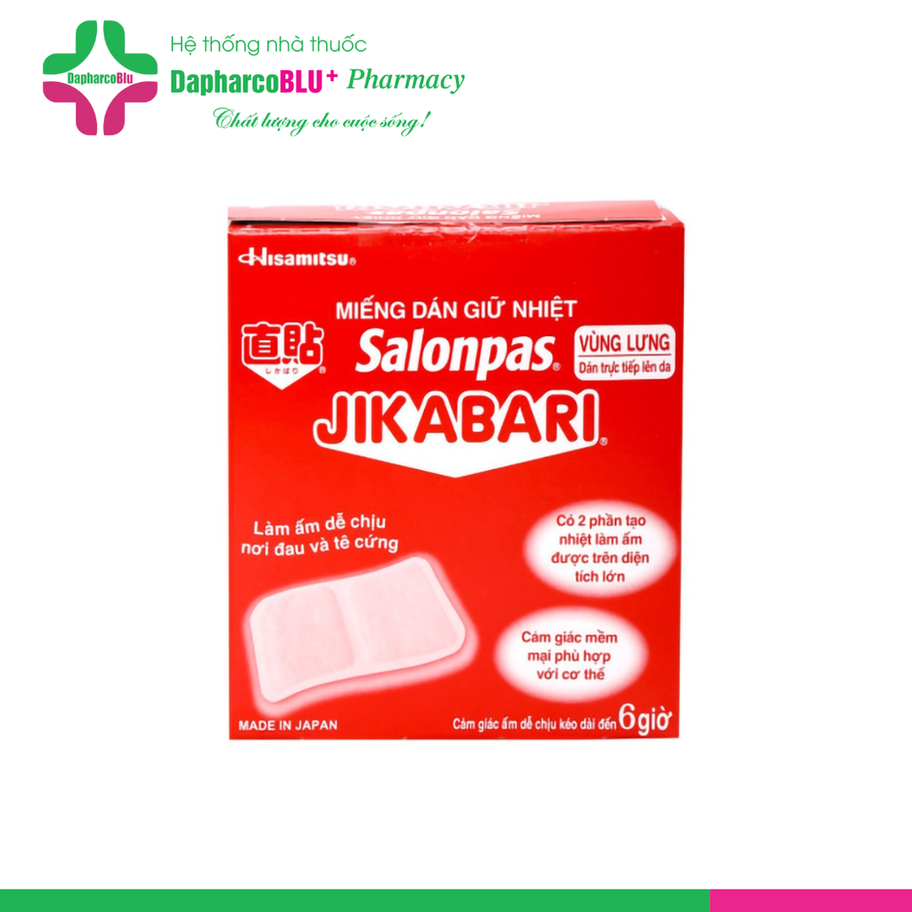 Miếng dán nhiệt Salonpas Jikabari Hisamitsu là miếng dán sinh nhiệt giúp làm ấm, nóng cơ thể, cải thiện vùng tuần hoàn, kích thích tiêu hóa, làm giảm các triệu chứng mỏi cơ, cứng cơ, đau cơ và khó chịu trong chu kỳ kinh nguyệt, đau dây thần kinh.