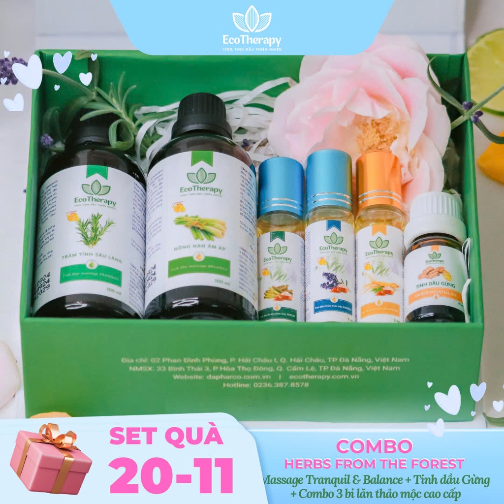 - Sét quà lớn gồm: Tinh dầu Massage Tranquil, Tinh dầu Massage Balance, Tinh dầu Gừng, Combo 3 bi lăn thảo mộc cao cấp.