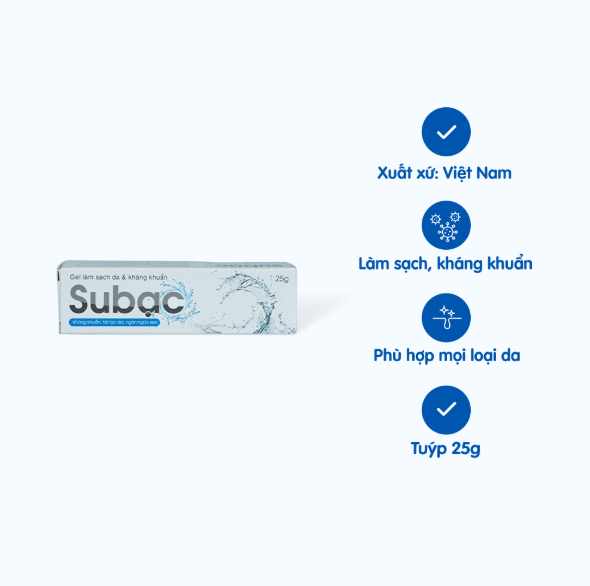 Gel Subạc giúp làm sạch da, kháng khuẩn, chăm sóc và bảo vệ da, làm dịu da khi bị: rôm sảy, mụn nhọt, zona, viêm da, herpes, thủy đậu, bỏng, bị sưng tấy do muỗi/ côn trùng đốt…